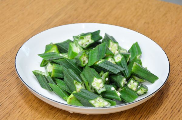 秋葵入开水锅焯烫2分钟,过凉水,斜切段