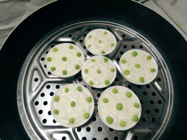 取几个浅口小容器,刷上油将豆腐鱼泥填人容器中。点缀上青豆