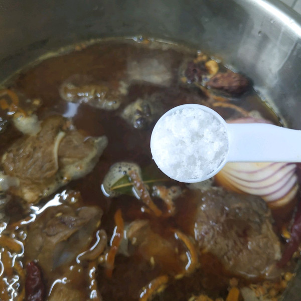炖肉全程保持最小火,锅里的汤汁似开未开的状态,炖煮2个小时左右(根据肉的状态决定,我炖了2小时15分钟,肉炖的太烂了,都不好切片,判断肉的状态在炖煮1.5个小时的时候用筷子扎一下牛肉有一点阻力即可)