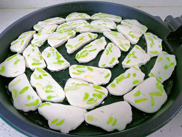 开小火烙,一面烙至颜色金黄后翻另一面,两面都烙至金黄焦脆后就可以出锅了。吃的时候蘸点白糖就可以了,超级香甜。 好吃的蚕豆糯米糕就做好了,口感软糯,味道清香,一口下都是春天的味道。