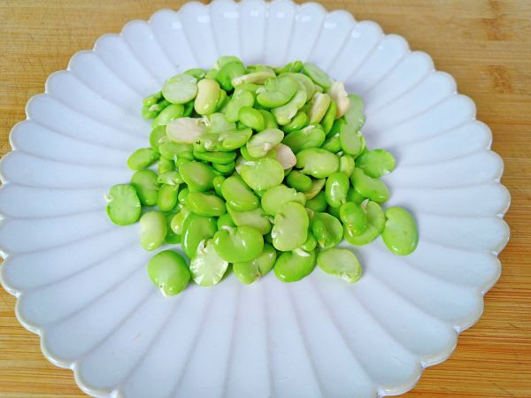 买回来的新鲜蚕豆200克,先剥去外壳,然后再剥去表皮,表皮就是那一层很薄的软壳。剥好后掰成两瓣,然后清洗干净后放一旁备用。