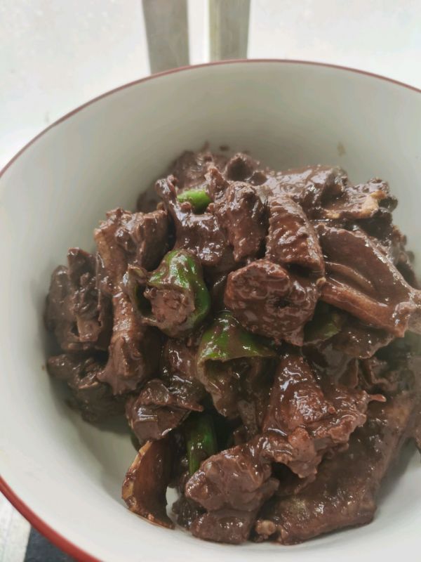 辣椒炒至断生之后,关小火把鸭血倒入锅中,慢慢翻炒均匀,确保每一块鸭肉都能裹上鸭血,翻炒均匀就可以出锅啦。