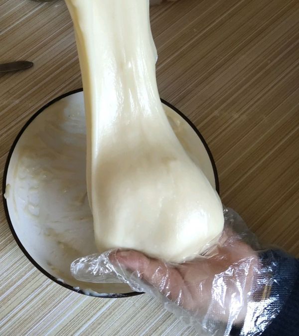 不烫手了,就这样反复拉扯折叠,这样糯米皮就不容易发硬,吃起来更软糯拉丝