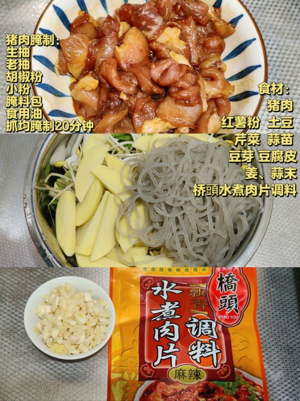 食材准备,猪肉切片,放生抽、老抽、胡椒粉、小粉、桥頭水煮肉片调料里面的腌料包,抓均匀,再淋上食用油抓匀锁上水分,保持肉的嫩度。