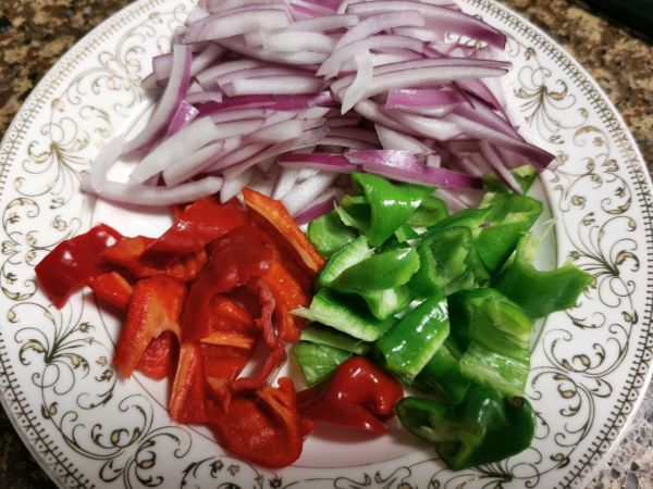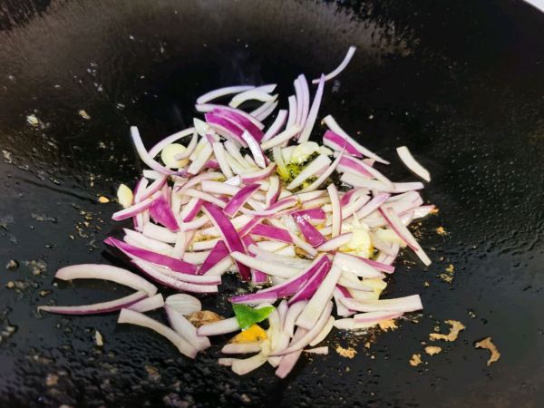 用锅内剩余的油炒洋葱丝和大蒜,炒出香味后再加青红椒一起翻炒
