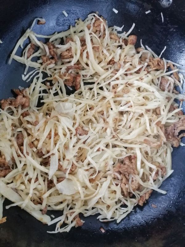 加入之前的圆白菜胡萝卜鸡蛋,一起翻炒,可以稍微加点老抽