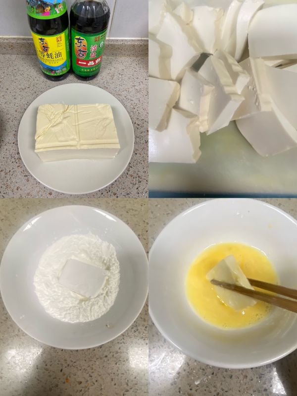 把豆腐切稍微厚点的片,裹上一层薄薄的淀粉,在放到鸡蛋液里面沾上一层蛋液。