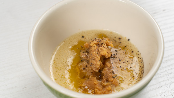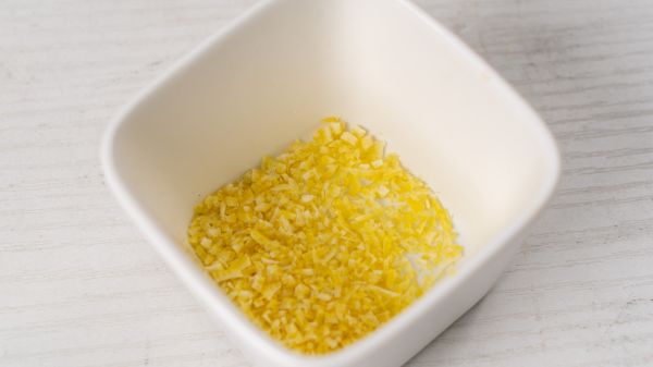 在柠檬汁内放入一勺白味增,倒入黄油,搅拌均匀,柠香汁完成;