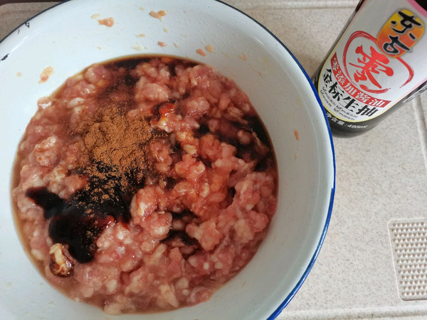 把花椒水、1个鸡蛋放入肉馅中搅拌均匀