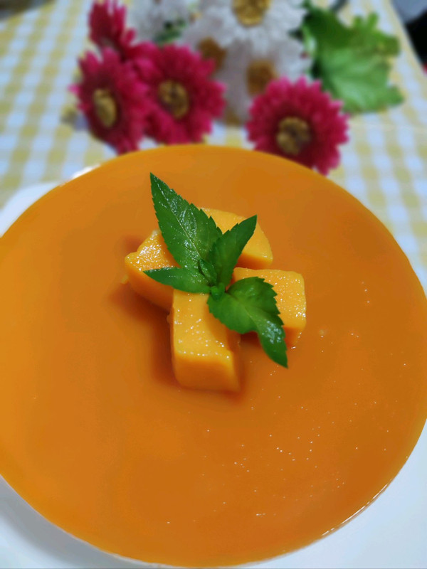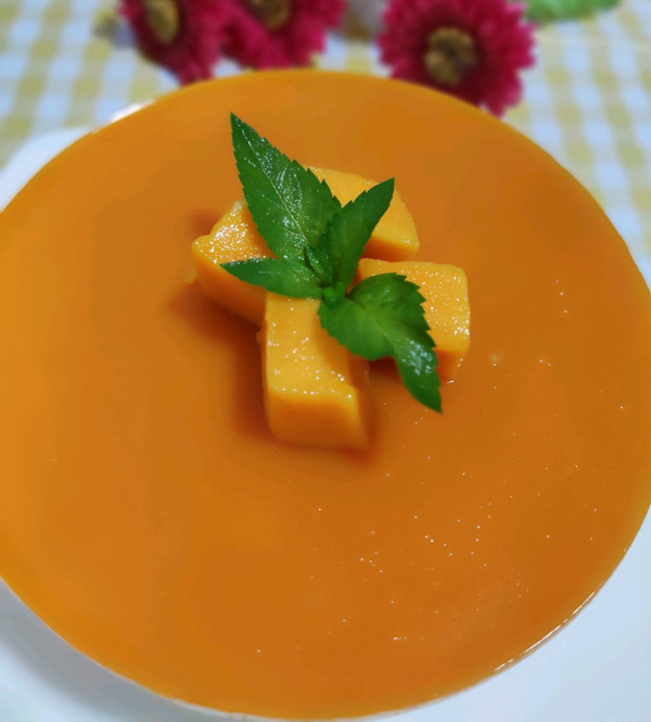 装饰一下。切几块芒果粒,加薄荷叶,完美