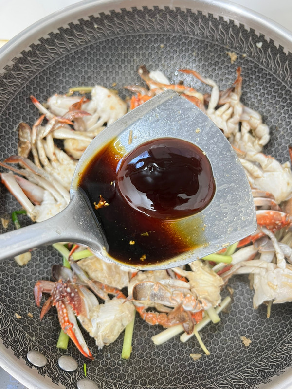 挖个洞,加入些许油,将姜丝,蒜瓣,葱白段加入炒香与花蟹一起翻炒均匀。