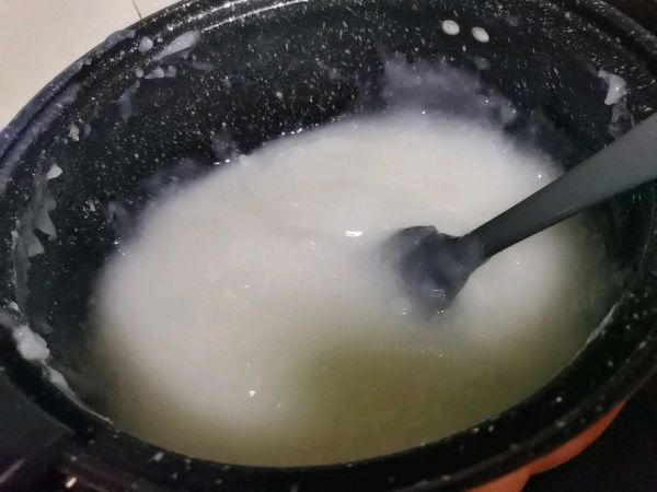 锅内加1000g水烧开,然后将化开的碗豆慢慢倒入锅中,一边倒一边搅,最关健的一步。煮5分钟左右,透明状就热了。