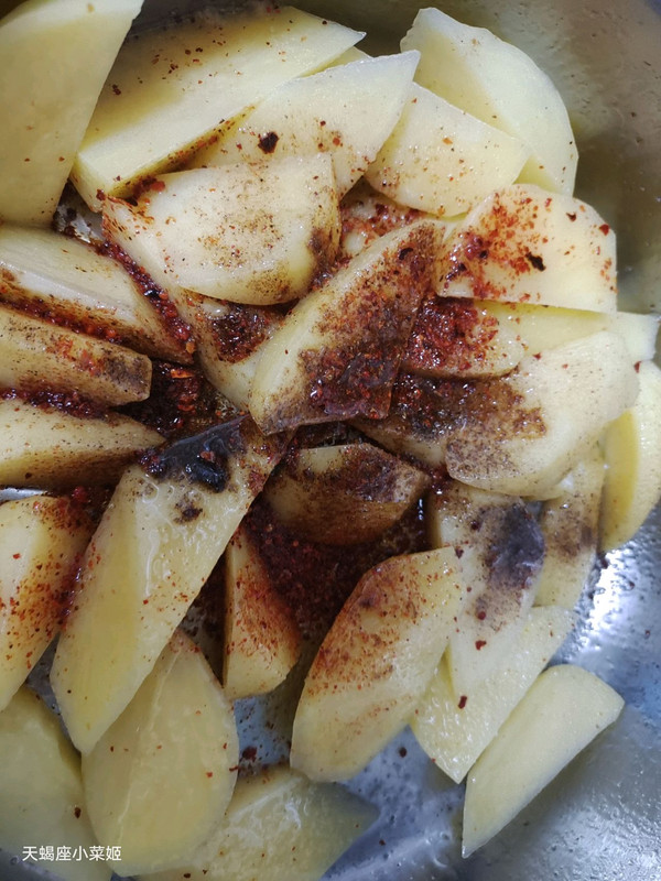 将土豆放入一个大盆中,加入食盐,花椒粉,五香粉,胡椒粉,辣椒面,孜然粒,