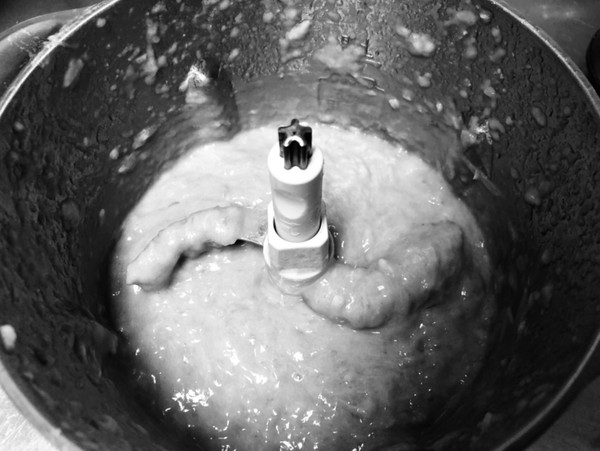 把鲅鱼肉挑出来,鱼肉里加一个蛋清、料汁汤、一勺白酒和一丢丢太太乐鸡精。绞肉机多转一会让鱼肉充分吸收水分。做这个菜用的鲅鱼馅很少,剩余馅可以做肉丸和包饺子。