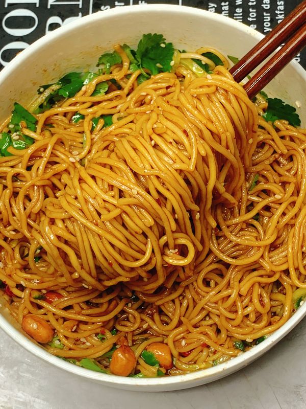 2️⃣水开方面煮熟,捞出过一下凉水更劲道,然后放入一勺茶油拌匀,加入香菜,黄瓜丝,花生米,倒入调好的酱汁拌匀开吃啦~