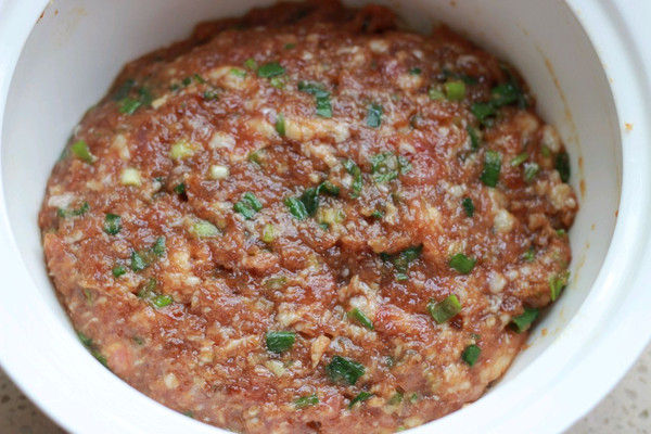 猪肉加50克水绞成肉馅,或者买来的肉馅加50克水顺时针搅打,加入馅料部分的调料,顺时针搅拌