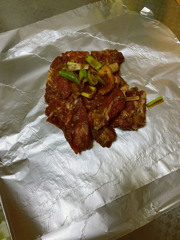 桌子上铺锡纸,最少要两层,把腌好的肉放上去,腌料也都倒上去,用锡纸包起来,这里注意一下,锡纸的封口要朝上,不要翻来覆去的包很多层