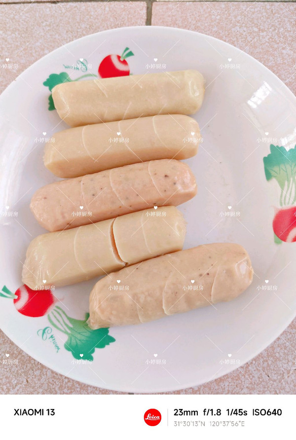 准备好烤肠,我这里是两根黑胡椒的,三根玉米肠。然后用刀在烤肠上划三刀,以便更好的受热而产生焦香
