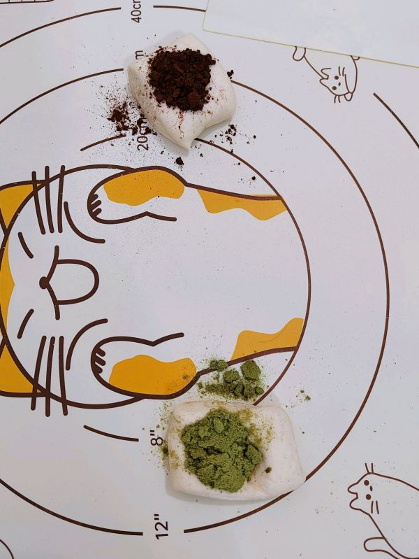 .取两份加入可可粉和成面团,一份多加点菠菜粉,一份少加点和成深浅二种面团