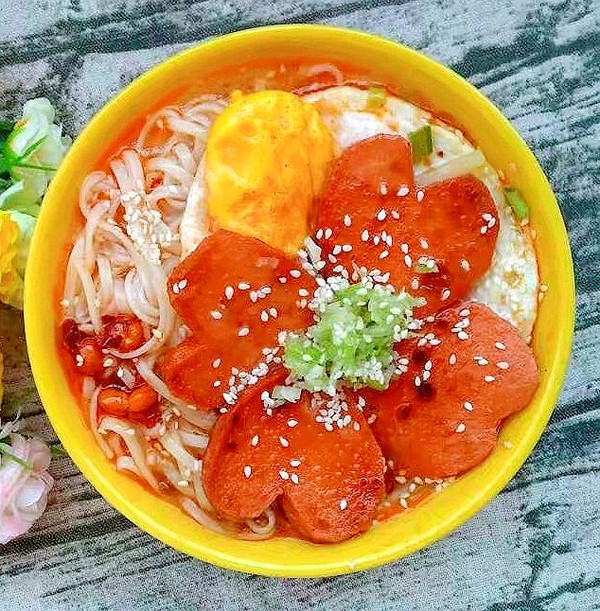 最后摆上煎好的火腿肠爱心,撒上香芝麻,放上葱花,一道爱意满满的火腿肠爱心鸡蛋面就做好了。