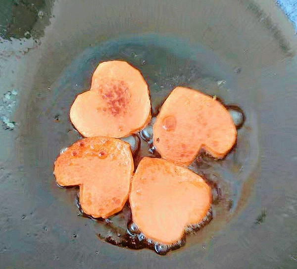 锅里烧热油,放入心形火腿肠煎至两面金黄。