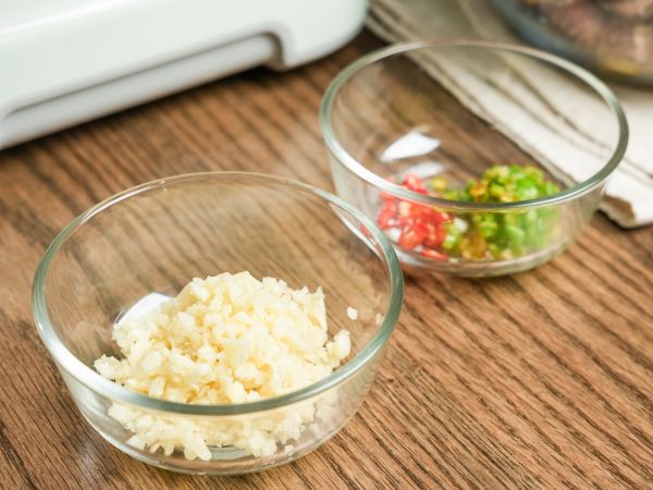 5.大蒜切末,青红椒切小粒。