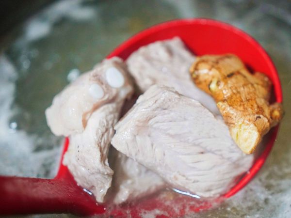 锅里提前烧水,水开后将肋排放入锅中。 放入拍过的老姜,小火炖煮30分钟。
