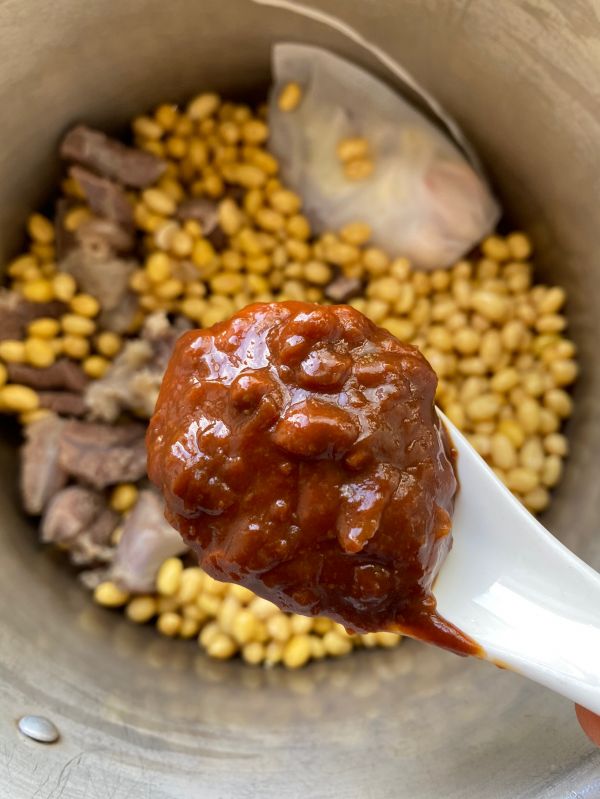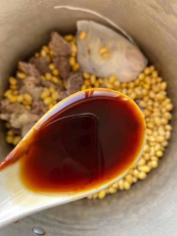 锅中放入洗净的黄豆,牛肉香料包,加一勺黄豆酱调味