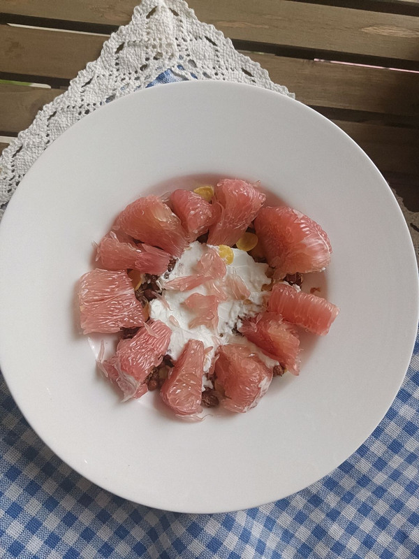 周围一圈摆上柚子块,中间撒上柚子粒。