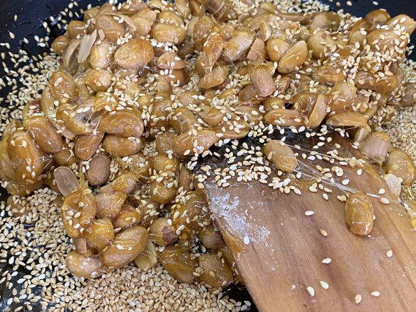 把花生和芝麻放进锅内,迅速翻拌,让糖均匀的裹满花生和芝麻(熟花生可以买现成的,也可以自己烤,一定要用原味的,我是用烤箱自己烤的,烤箱设置上下火170度烤20-25分钟,期间每隔10分钟翻动一次花生,烤好晾凉把花生皮搓掉备用就行)