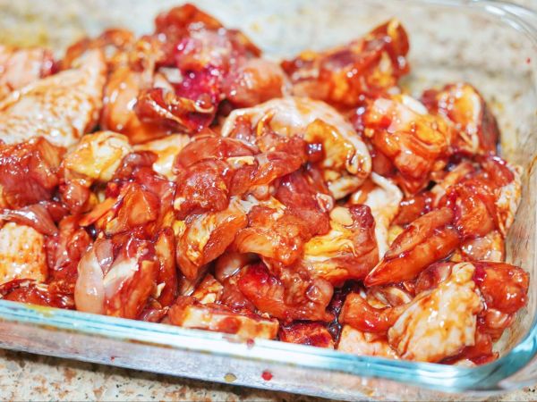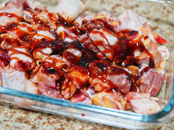 洋葱分布锅底,腌制好的鸡腿,平铺在洋葱上。