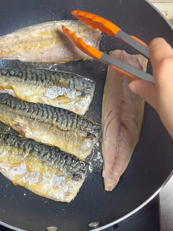 青花鱼提前一晚并序冷藏解冻 锅中倒入少许茶油,放入青花鱼中火皮冲下减脂微焦