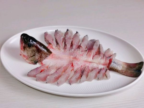 鱼身中间的鱼骨去掉,把肉片下来,将肉切成梳子状。