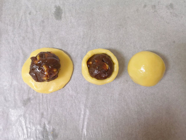 取一个月饼面团压扁,放上枣泥核桃馅,用虎口推挤收口滚圆。
