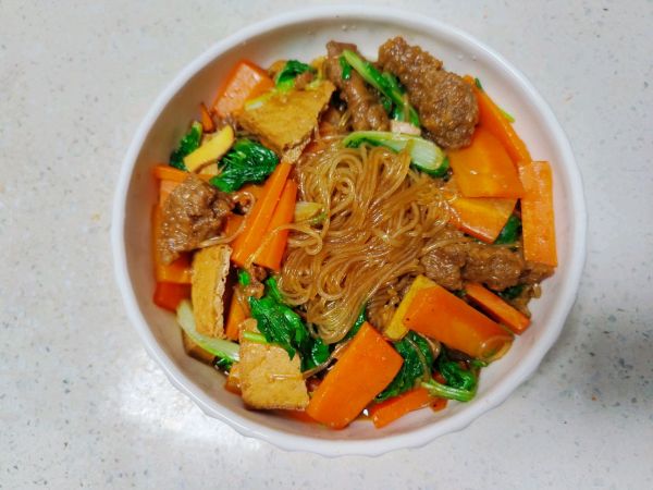 锅中留底油放入胡萝卜香菇翻炒,加两勺蚝油,1勺生抽,半勺老抽少许十三香翻炒均匀