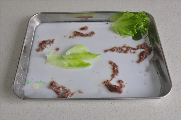 然后倒入一层薄薄的米浆,放入牛肉片,把洗干净的生菜也放入蒸盘