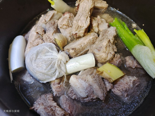 将排骨放入高压锅内,加入大块葱姜,炖肉料包,盐和焯排骨的汤,高压压制20分钟