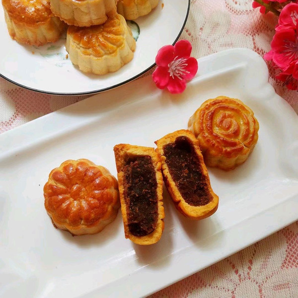 烤箱180℃烤15~20分钟,中间复刷一次蛋黄液,烤至月饼外皮金黄。