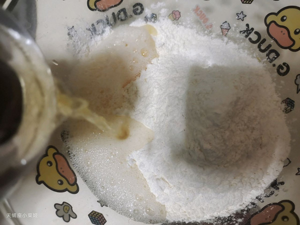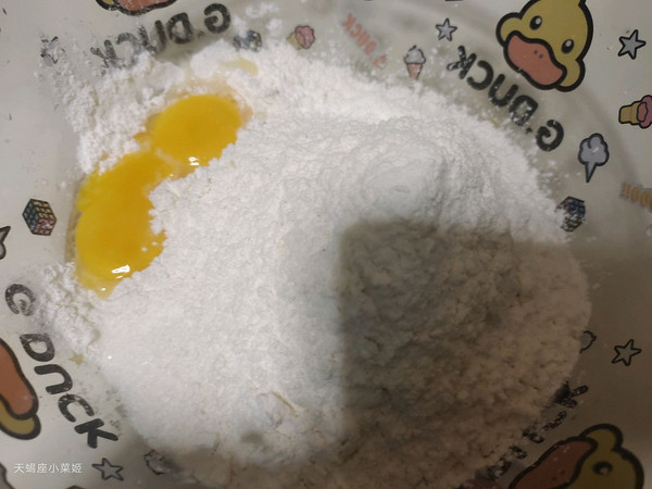 另取一盆加入中筋面粉,土豆淀粉,无铝泡打粉,蛋黄,盐,
