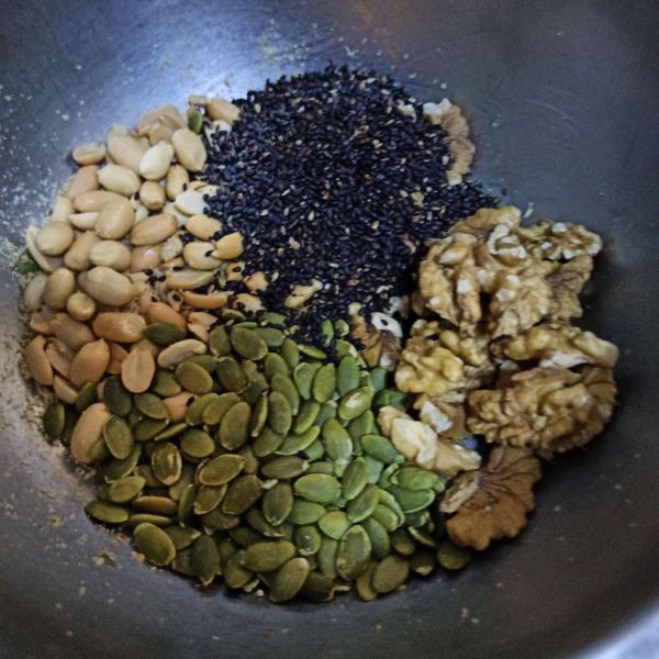 往坚果碎里放熟粉、白糖、花椒粉、盐、猪油、玉米油翻拌均匀。