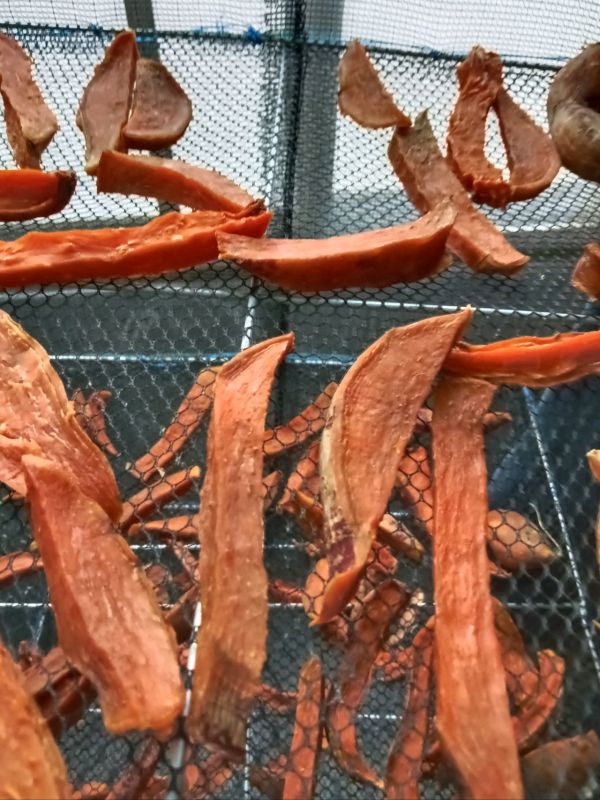 把蒸好的地瓜干放在晾网上,用这种晾晒网特别方便,重要的是能阻拦苍蝇虫子,第一晒需要两天,外皮才能没有水分。