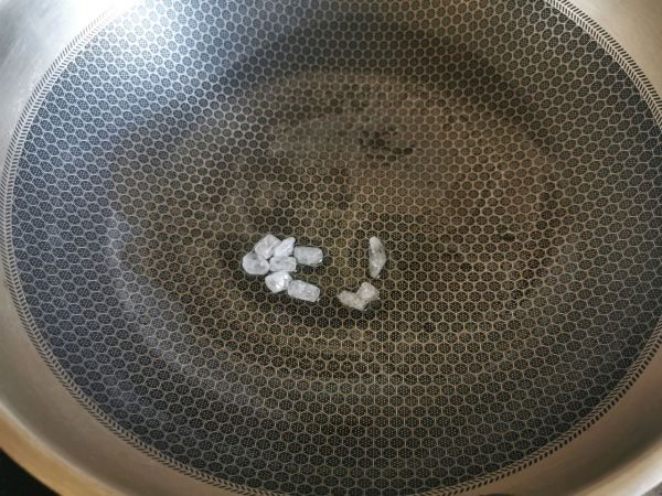 热锅放少量油,放10克冰糖,中小火,熬至焦糖色后加2汤匙开水。