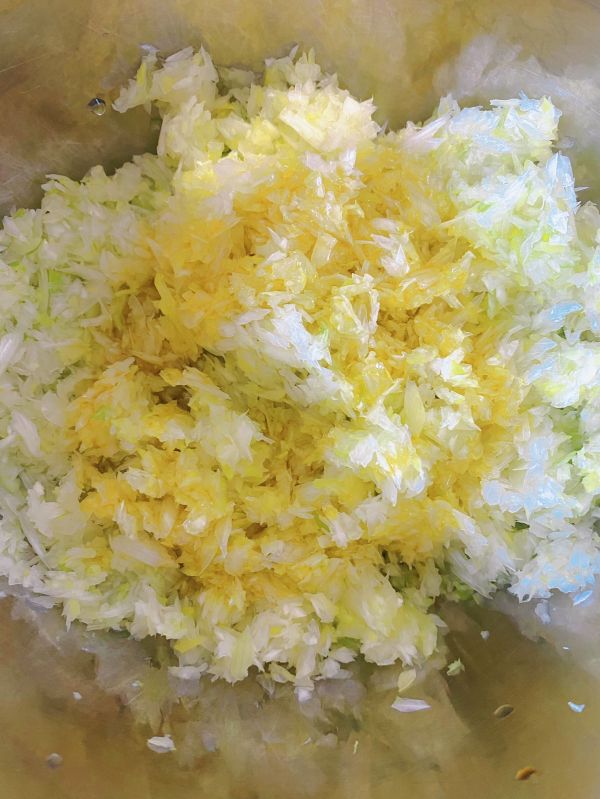 羊腿肉(三分肥七分瘦)稍微解冻后(不要完全融化),先切片再切丝再切小丁备用;