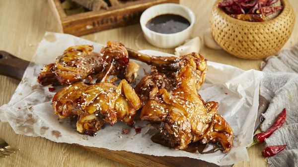 将调好的酱汁均匀地涂抹在鸡腿上,撒上白芝麻,将蒸烤盘再次放回烤箱
