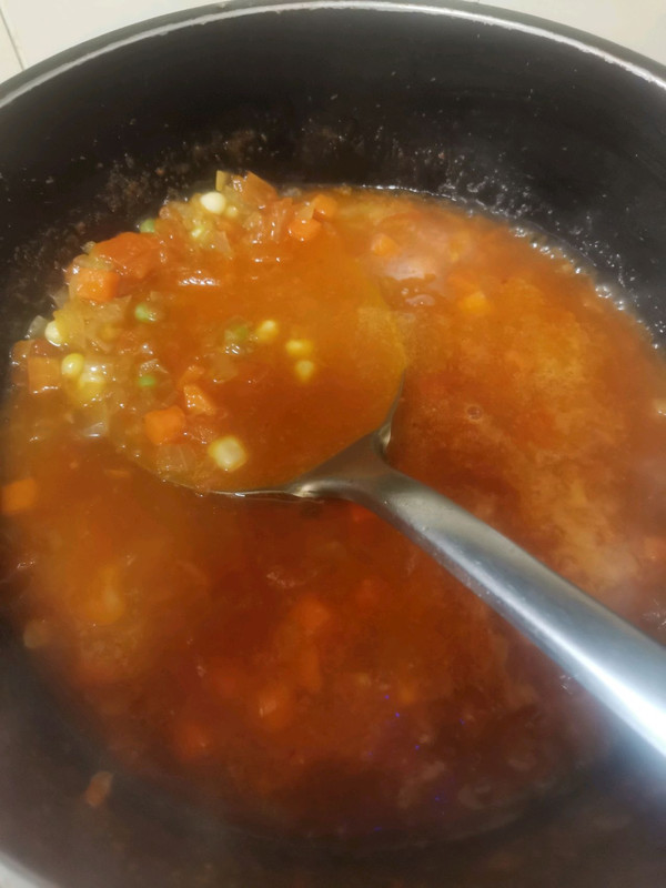 起锅煸香洋葱末,加入番茄碎,炒出沙,再加入什锦蔬菜粒,水淀粉,炒,关火浓稠