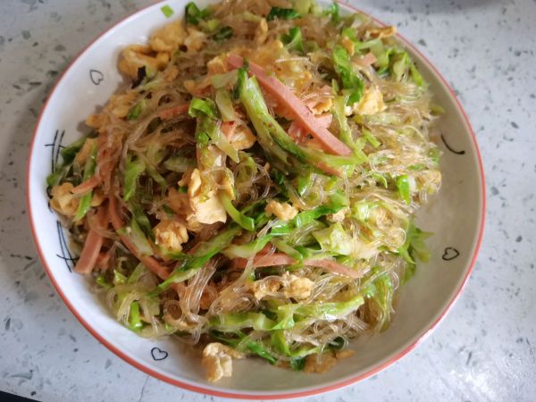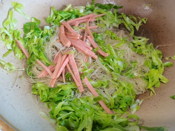 准备工作:包菜和火腿肠切丝,鸡蛋加入少许盐打散,粉丝用温水泡软加入适量生抽、盐、油抓拌均匀