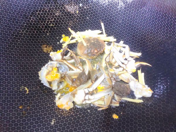 锅中倒入少许油,放入姜丝、螃蟹爆炒至变色!