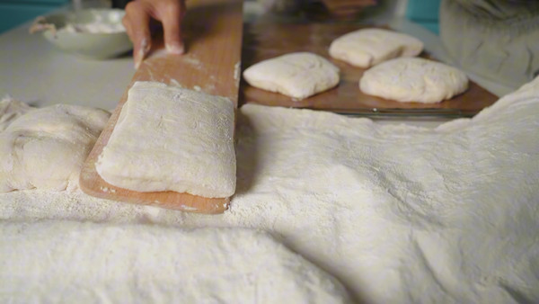 ✅发酵好的面团,纹路面向上,用转移板转移到油布上)