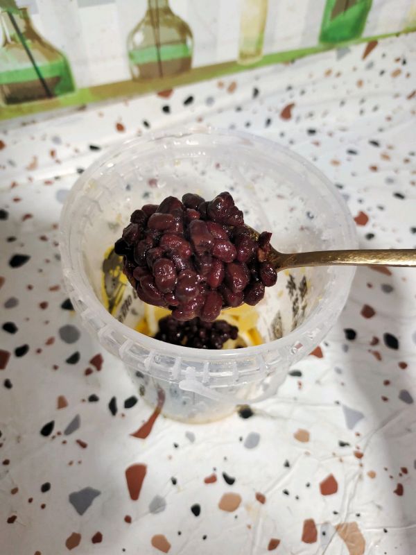 加入两勺自己做的蜜豆!(没有蜜豆的可以不放,也可以换成珍珠或者椰果粒!)