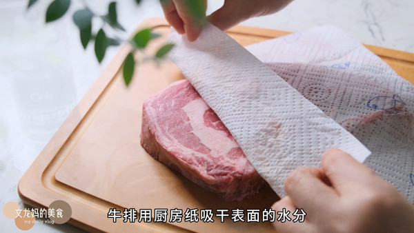 放入牛排中火煎2-3分钟(这时可以放迷迭香增加牛排风味)肉的表面出现水汽时就可以翻面,同样煎至表面有水分出现
